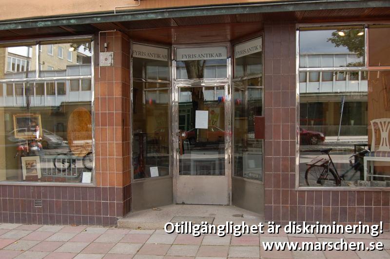 Hög kant och smal dör gör att det inte går att komma in i butiken för personer som använder rullstol. Läs hela anmälan om Fyris antik …
