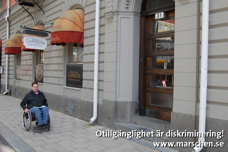 Trappsteg i ingången utestänger och diskriminerar därmed kunder som använder rullstol.