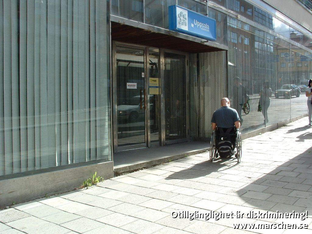 Ett steg i ingången utestänger och diskriminerar därmed kunder som använder rullstol. (Uppföljning 2008-04-25- Åtgärdat ) Läs hela anmälan om Uppsala kommuns tryckeriservice …