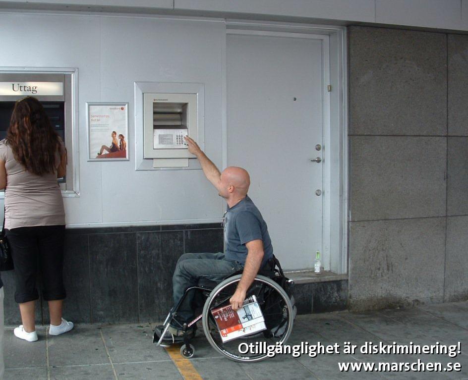 För att kunna använda bankomaten tvingas man kliva upp på en ca 20 cm hög uppbyggnad som har en yta av ca 40 x 80 cm. Detta utestänger och diskriminerar därmed personer med funktionshinder som använder rullstol.