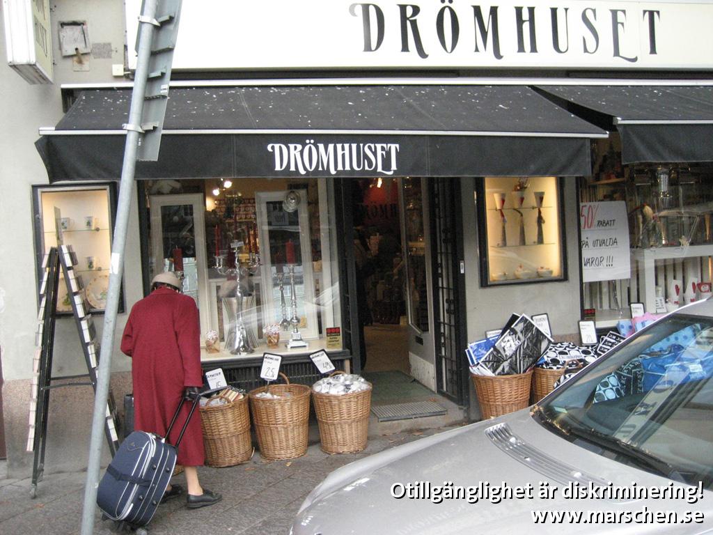 Ett trappsteg i entrén utestänger och diskriminerar därmed kunder som använder rullstol.