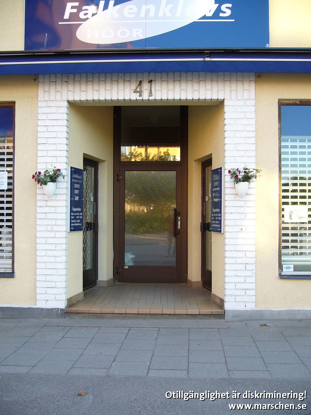 2 trappsteg stoppar rullister (rullstolsburna) från att komma in.