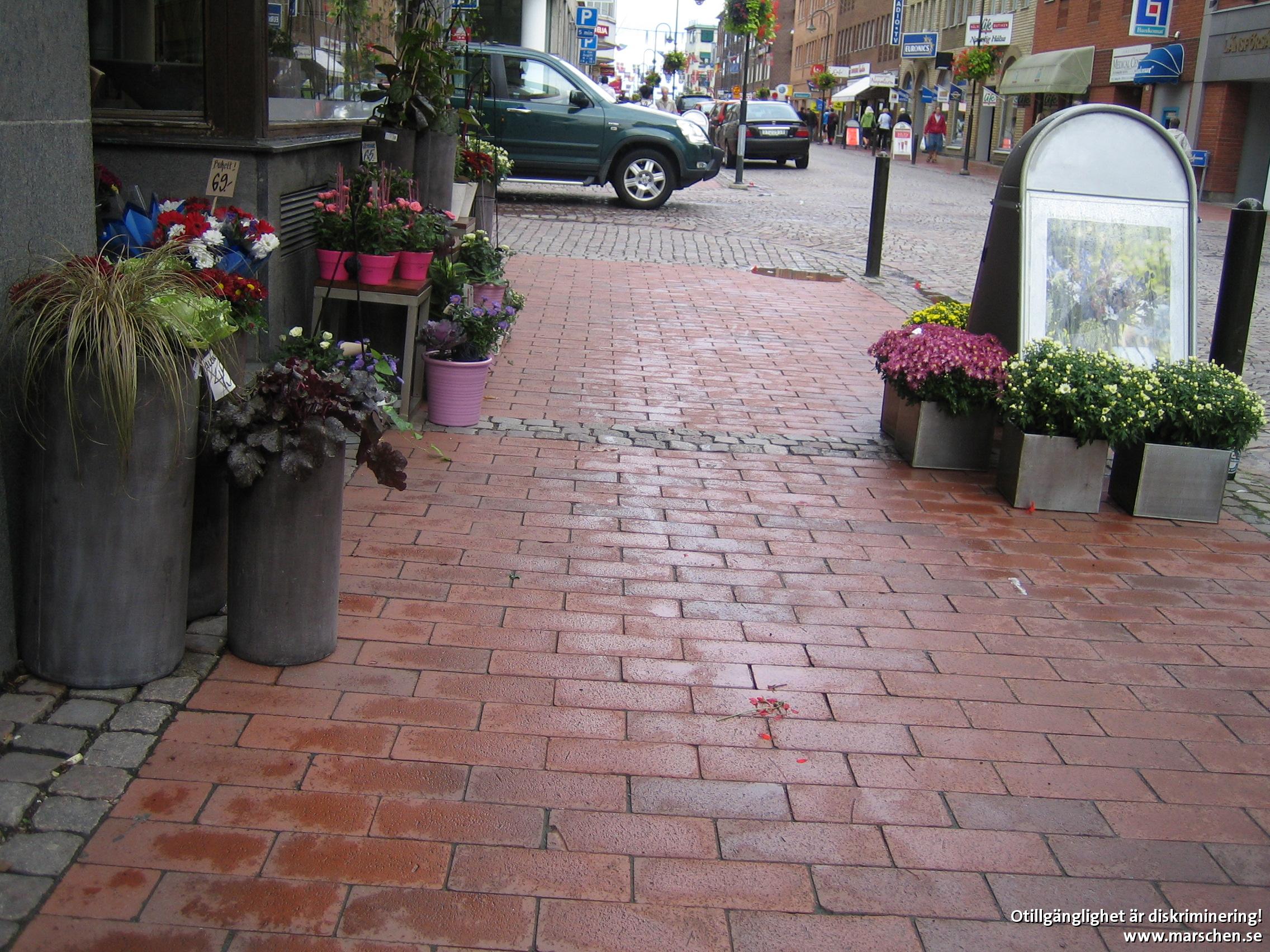 Två trappsteg hindrar personer som har rörelsehinder att ta sig in i affären. När affären är öppen står det en massa blommor utanför butiken. Blommorna utanför butiken försvårar för personer med synskador/blindhet att ta sig fram utanför affären.