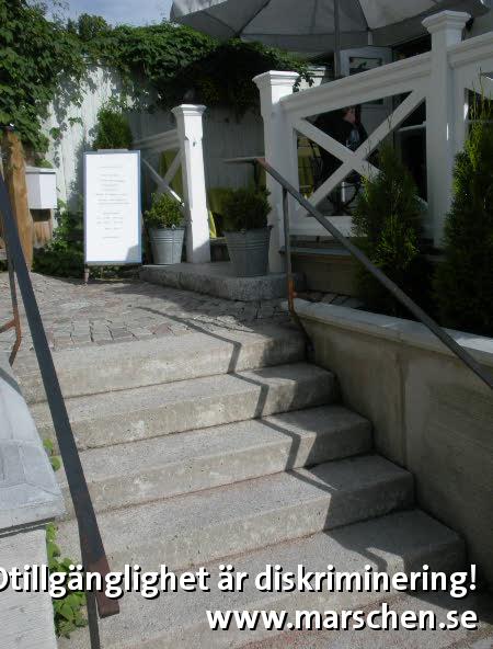 En trappa som är omöjlig för cafébesökare som använder rullstol att ta sig upp för.