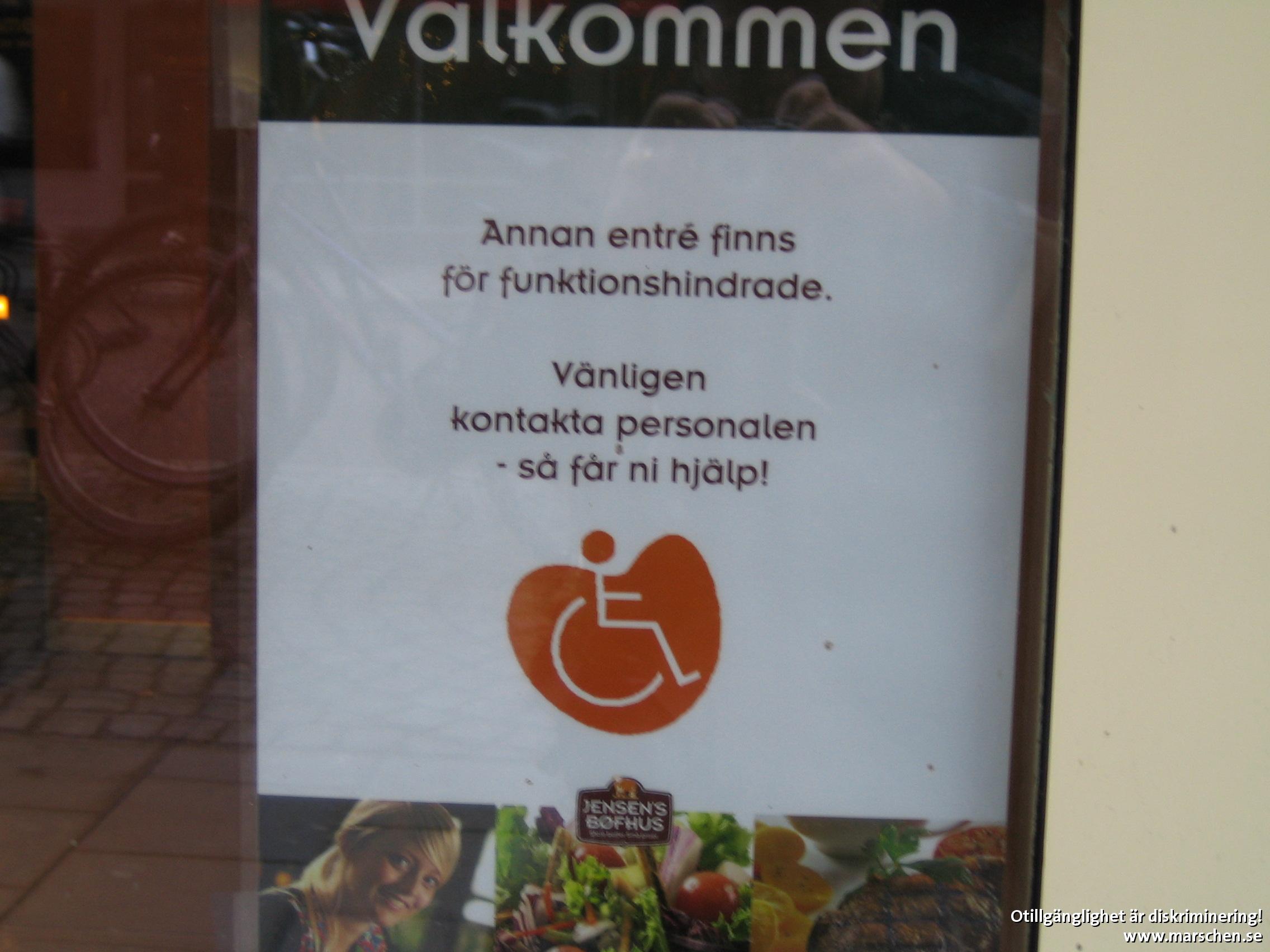 SKÄRPNING JENSENS BÖFHUS! Man ska inte behöva gå in genom en annan entré bara för att man har ett rörelsehinder. Då kan ni lika gärna ha samma entré för alla!