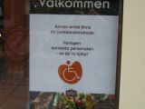 Bilden på skylten "Annan entré finns för funktionshindrade Vänligen kontakta personalen -Så får ni hjälp!"