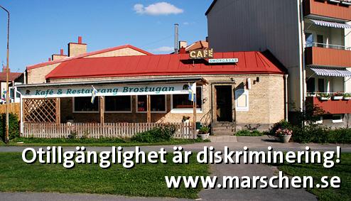 Skulle aldrig kunna fika eller äta på Café & Restaurang Brostugan då det inte finns någon ramp. Finns endast trappa på fyra steg! Omöjligt att ta sig in med rullstol!