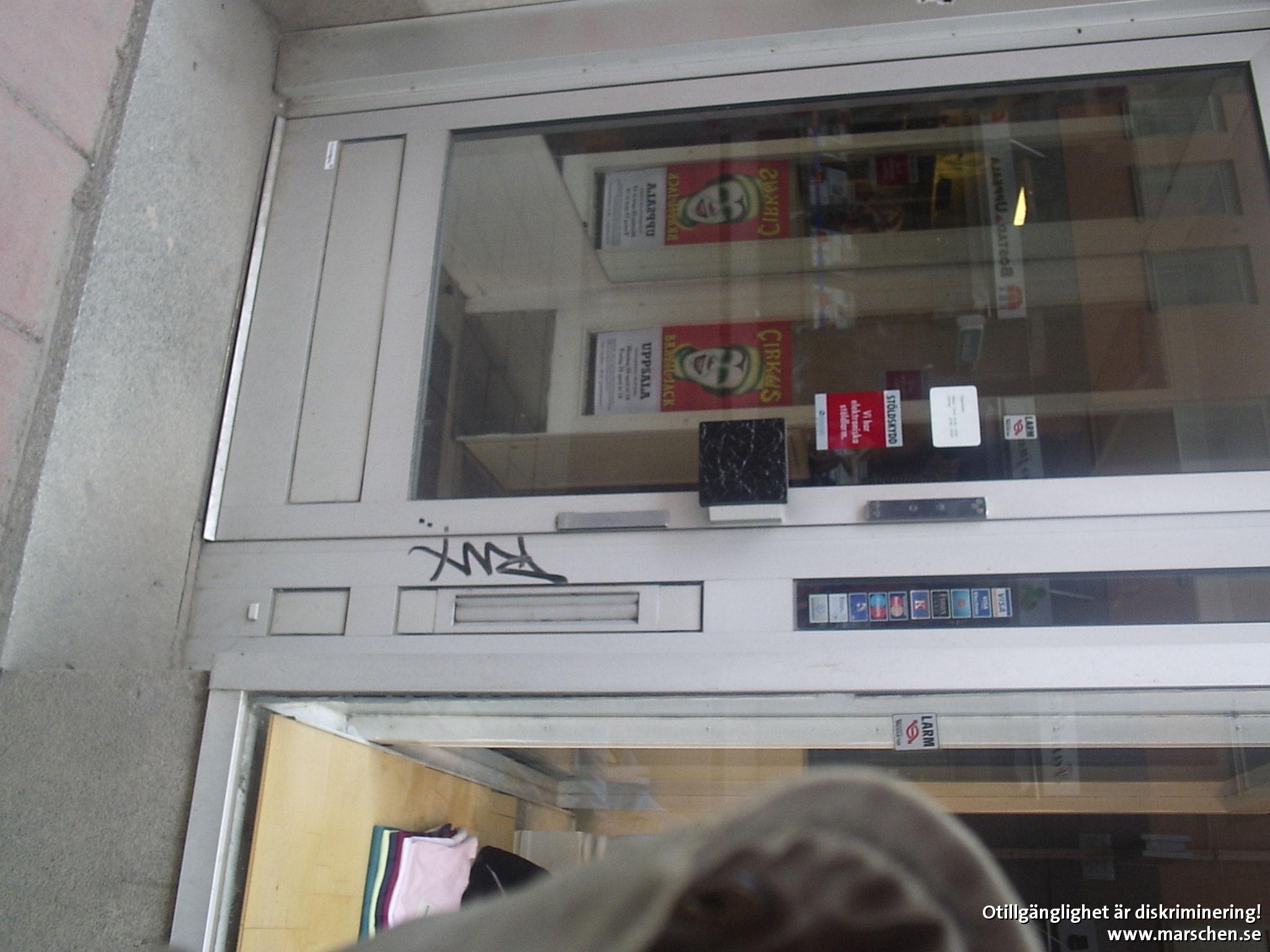 Litet trappsteg upp till ingången och dörröppnare saknas. Det gör det svårt för rullstolsburna att ta sig in.