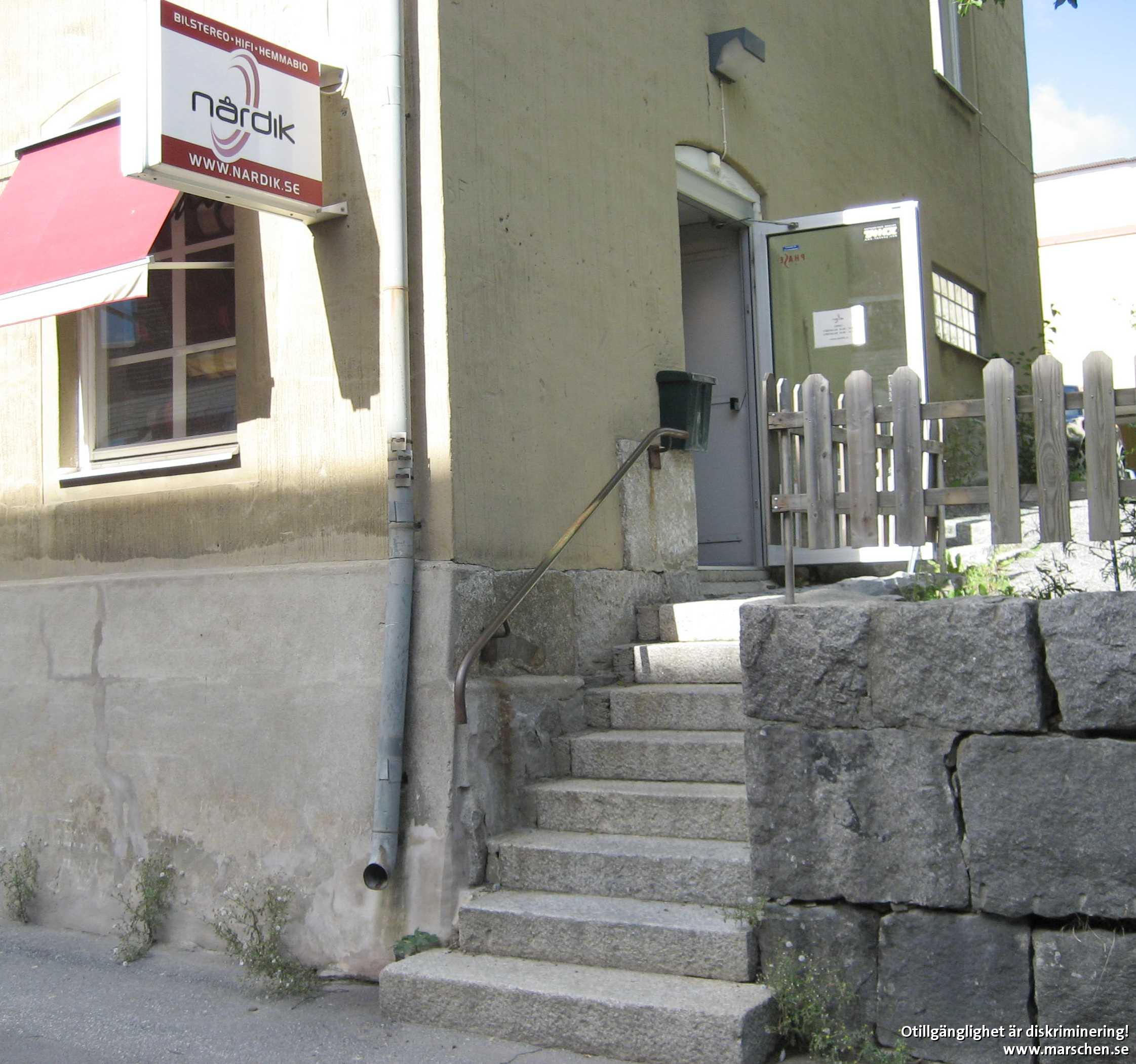 Upp till Nårdik bilstereo, Hi Fi, hemmabios entré är det åtta (8) trappsteg. Detta omöjliggör för personer som använder rullstol att ta sig in till butiken. Nårdik gör sig därmed skyldig till diskriminering.