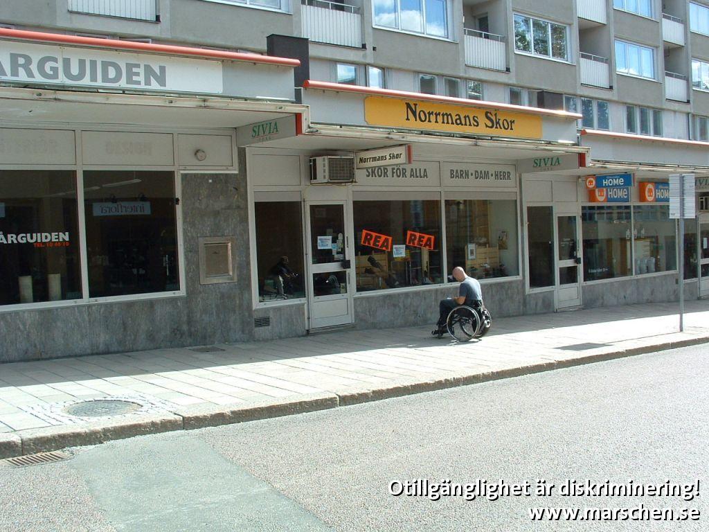 Ett steg i ingången på över 1 dm utestänger och diskriminerar därmed kunder som använder rullstol.