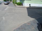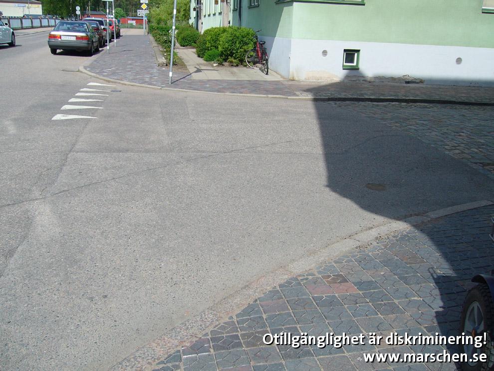 Saknar 0-kant, 3 cm hög trottoarkant ena sidan och stoppar därmed rullstolsburen.