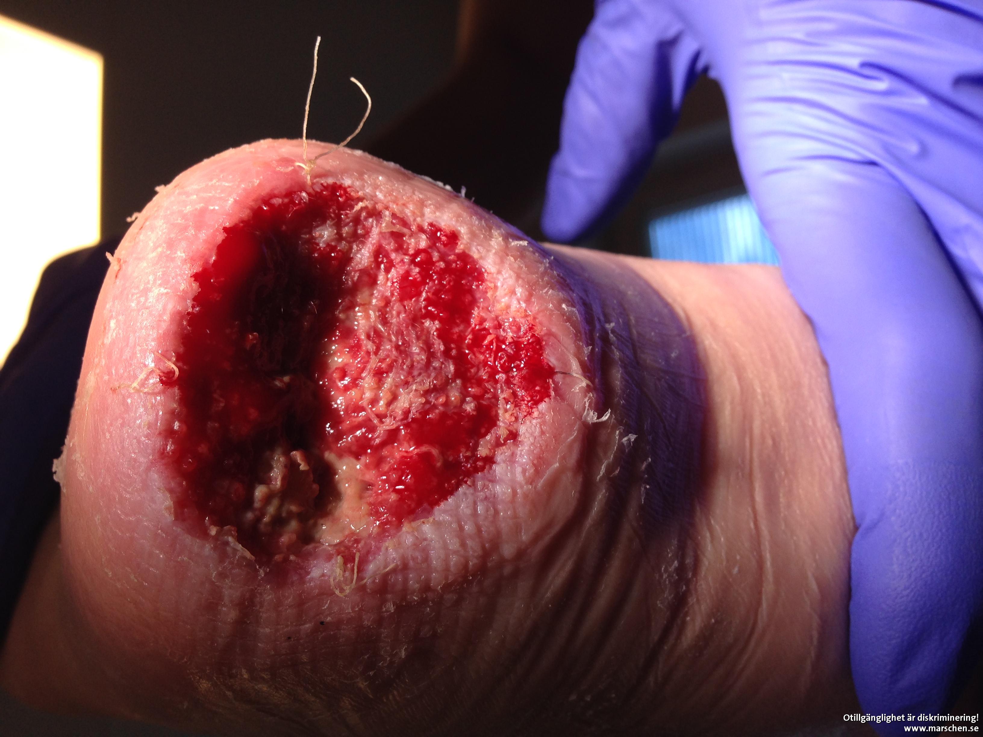 Av helbensgipset fick jag sedan en nekros på hälen, det vill säga död vävnad av häl. Läkaren ville amputera mitt ben. Vilket jag vägrade.