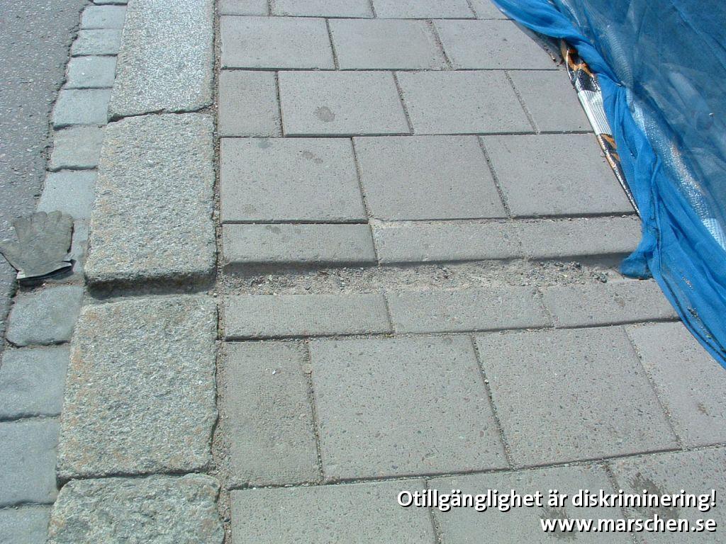 Rännilarna för regnvatten på trottoaren på vänster sida på Vaksalagatan (sett från stan) på Vaksalagatan är av den gamla typen, med ett djup på flera centimeter. Detta gör det svårt för många människor som använder rullstol att passera.