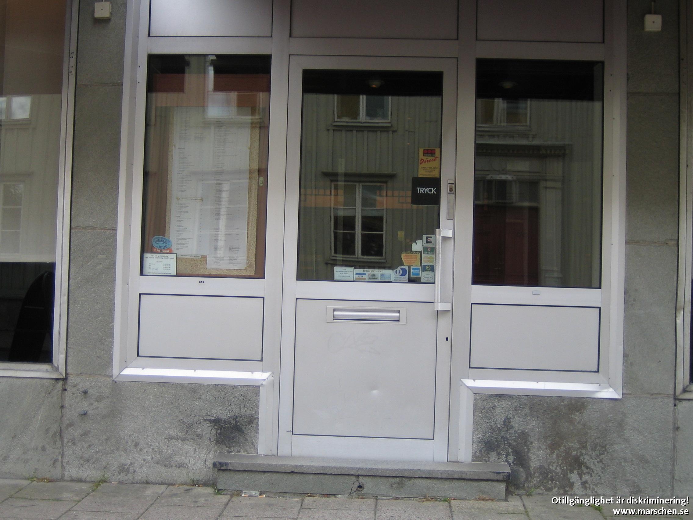 Fortfarande samma trappsteg och tunga dörr som hindrar personer som använder rullstol/rollator att ta sig in på restaurangen på egen hand.