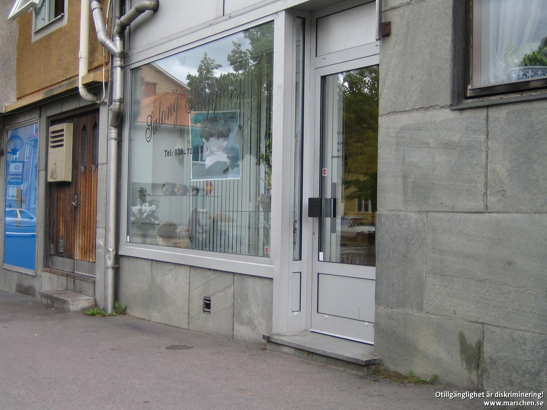 Fortfarande samma trappsteg som hindrar personer som använder rullstol/rollator att ta sig in på klippsalongen på egen hand