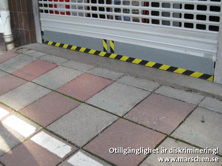 Lutningen i den förhöjda trottoaren till Sandahls Radio o TV Euronics är för kraftig. Den får inte överstiga 1:12 och gör den det blir det svårt eller omöjligt för människor med rörelsehinder att ta sig in till verksamheten. Insteget till butiken är inte heller plant, det har ett steg.