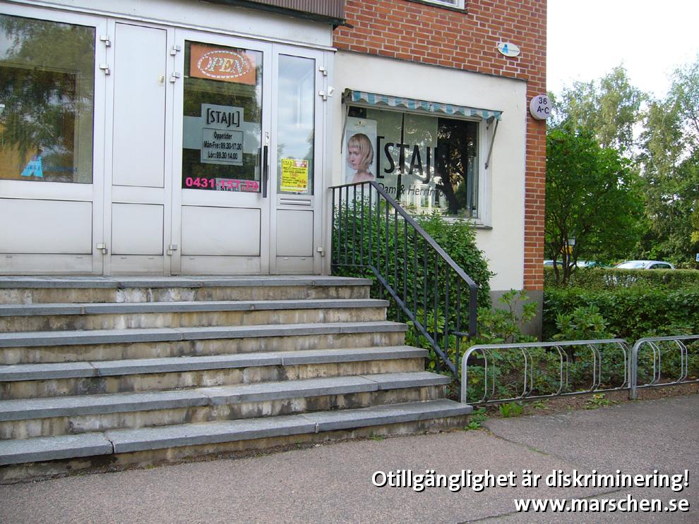 6 trappsteg i entrén stoppar kunder i rullstol eller med rollator. Kontrastmarkering saknas för synskadade.
