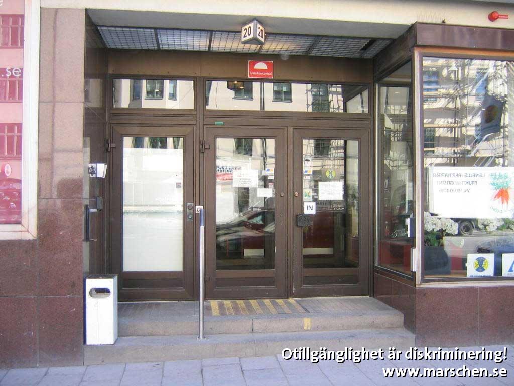 Hade jag bott här själv hade det aldrig gått. Man får gå in till receptionen för att tala om att man behöver använda rampen. Två trappsteg upp + 2 två tunga dörrar att öppna. Dessa byttes dock ut mot dörrar som öppnar sig själva sista dagen vi var där.