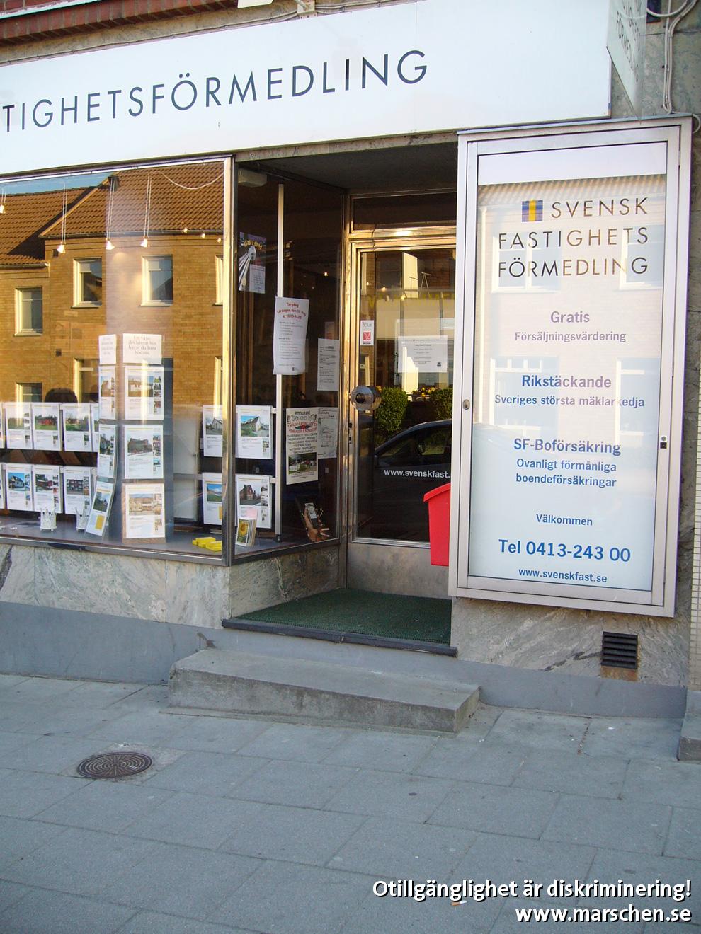 2 trappsteg i entrén stoppar kunder i rullstol eller med rollator. Kontrastmarkering och ledstänger saknas för synskadade.