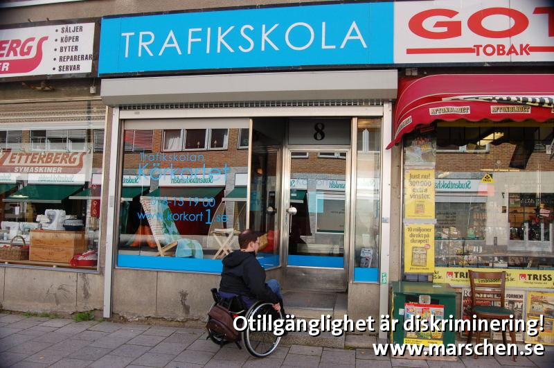 Trappsteg i ingången utestänger och diskriminerar därmed kunder som använder rullstol.