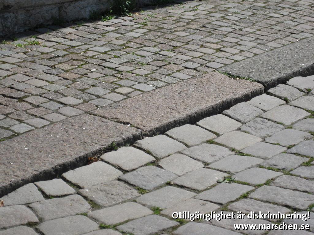 Trottoaren är inte plan, den är belagd med kullersten. Avfasningen är undermåligt utförd, inte nollkant. Det gör det svårt för människor med rörelsehinder att röra sig fritt i Visby.