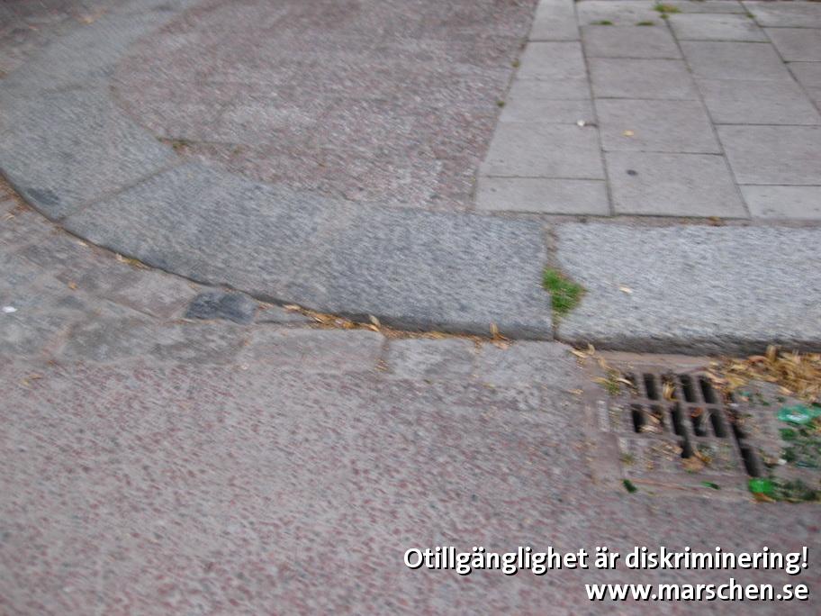 Avfasningen i trottoaren där passage över vägen vanligtvis görs är undermåligt utförd, ska vara nollkant. Det gör det helt eller delvis omöjligt att ta sig upp till och ner från trottoaren om man använder rullstol.