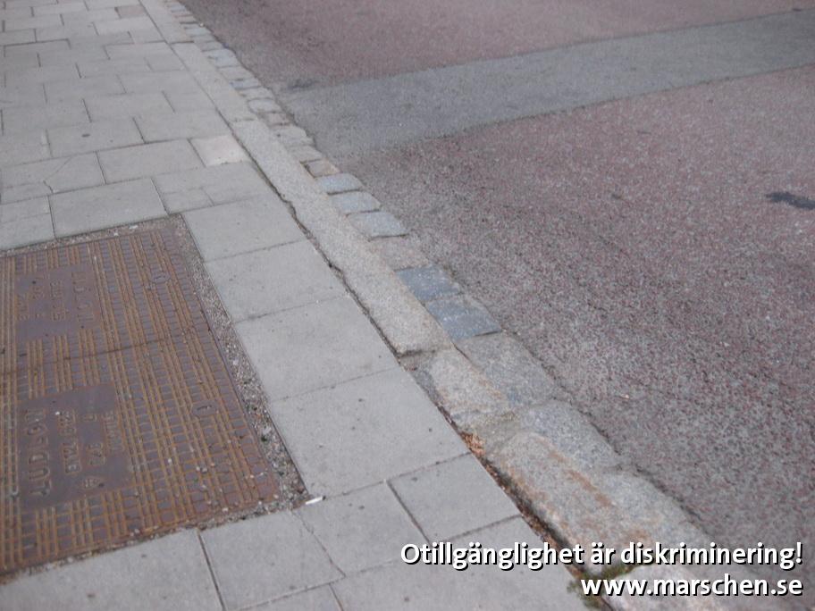 Avfasningen i trottoaren där passage över vägen vanligtvis görs är undermåligt utförd, ska vara nollkant. Det gör det helt eller delvis omöjligt att ta sig upp till och ner från trottoaren om man använder rullstol.