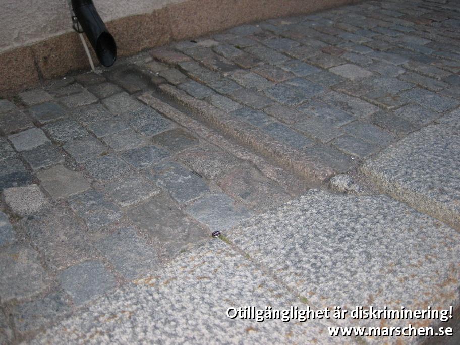 Rännilen för regnvatten på trottoaren är av den gamla typen, med ett djup på flera centimeter. Detta gör det svårt för många människor som använder rullstol att passera.