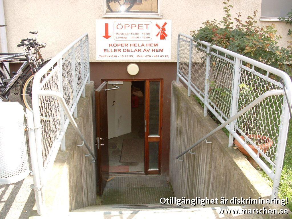 En trappa i entrén gör det omöjligt för kunder som använder rullstol att ta sig in. Det utestänger och diskriminerar därmed.