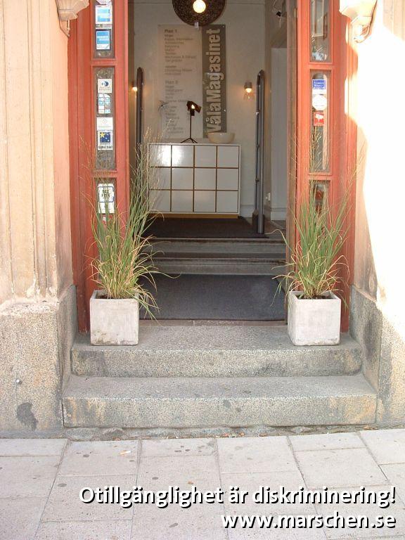 Två trappsteg i entrén och två ytterligare trappsteg innanför entrén utestänger och diskriminerar därmed kunder som använder rullstol.