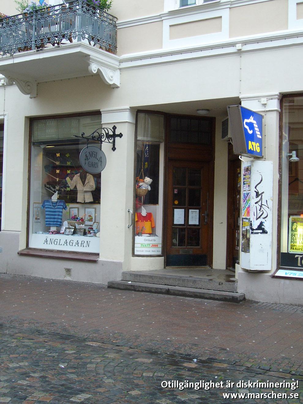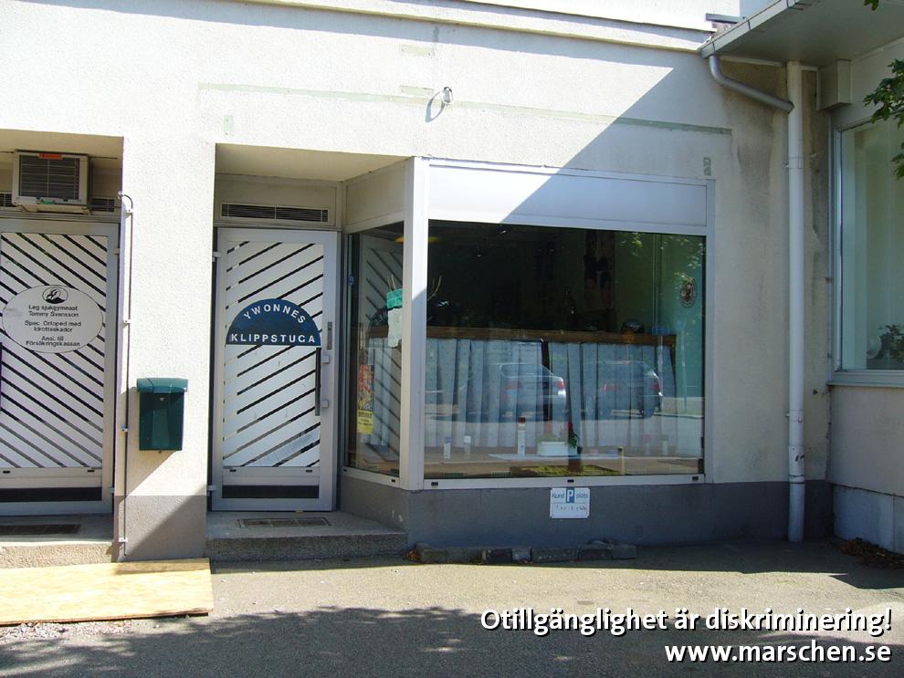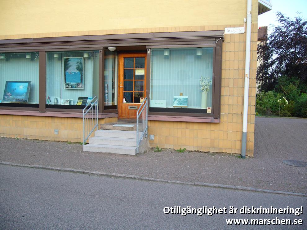 1 trappsteg i entrén stoppar kunder i rullstol eller med rollator. Kontrastmarkering och ledstänger saknas för synskadade.