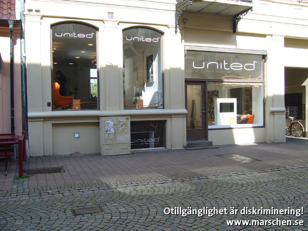 4 trappsteg i entrén stoppar kunder i rullstol eller med rollator. Kontrastmarkering saknas för synskadade.
