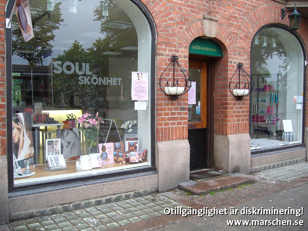 3 trappsteg i entrén stoppar kunder i rullstol eller med rollator. Kontrastmarkering och ledstänger saknas för synskadade