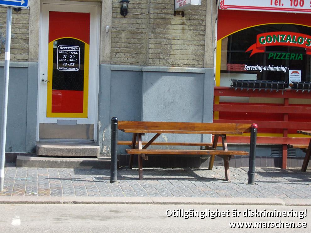 2 trappsteg i entrén stoppar person i rullstol eller med rollator. Kontrastmarkering och ledstänger saknas för synskadade. (Uppföljning 2010-11-21) Läs hela anmälan om Pizzeria Gonzalo’s …
