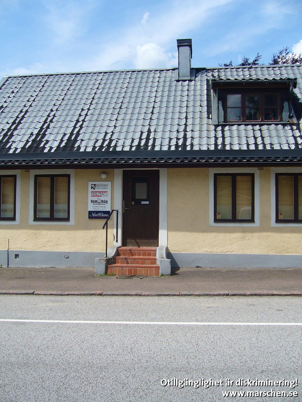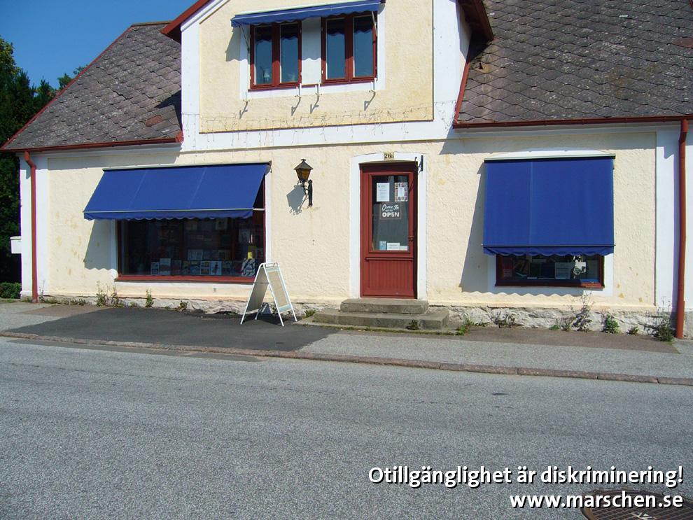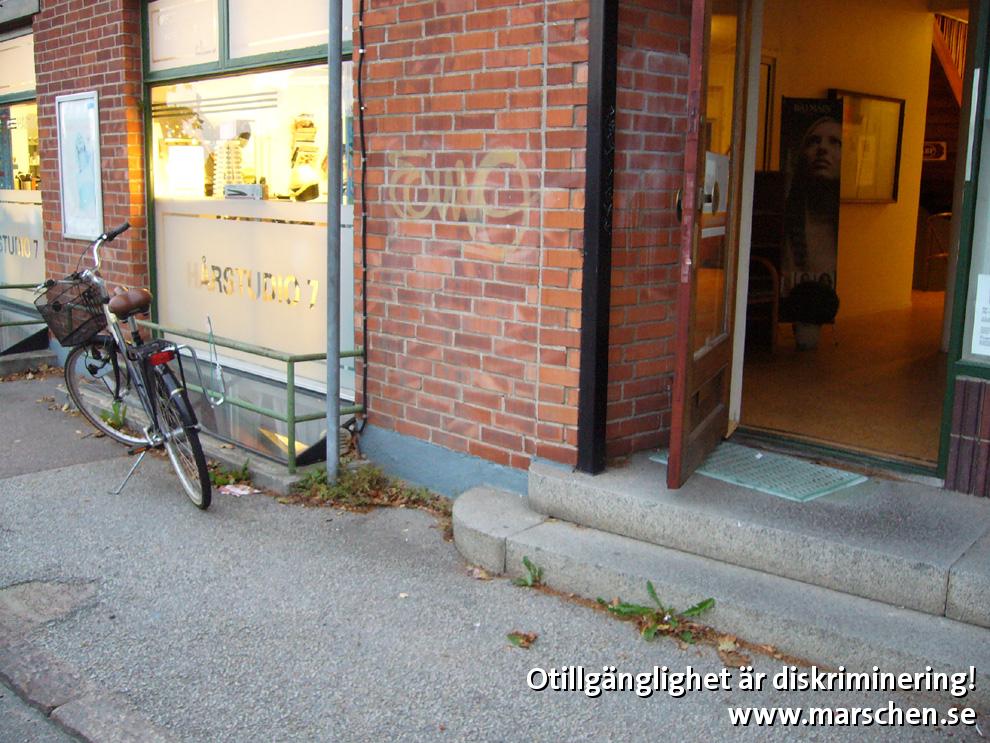 2 trappsteg i entrén stoppar kunder i rullstol eller med rollator. Kontrastmarkering och ledstänger saknas för synskadade.