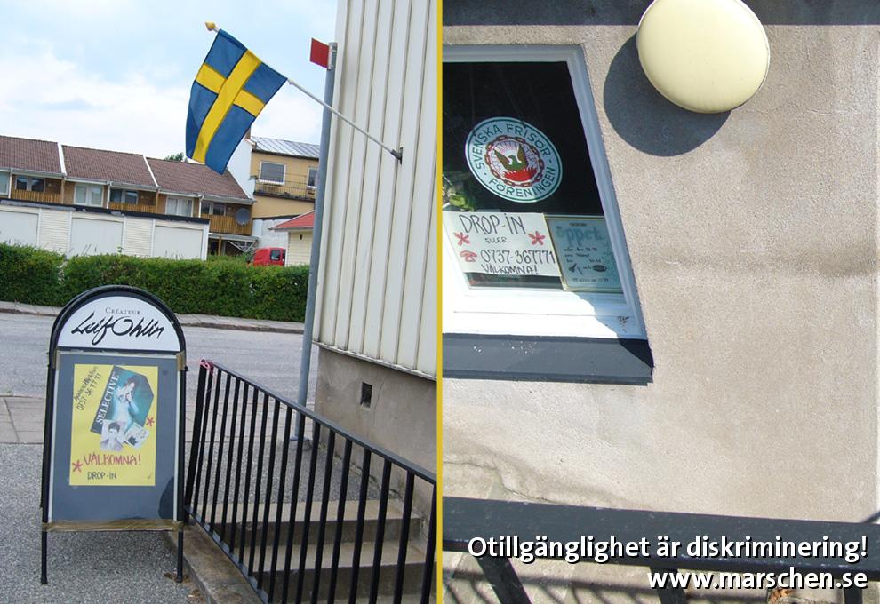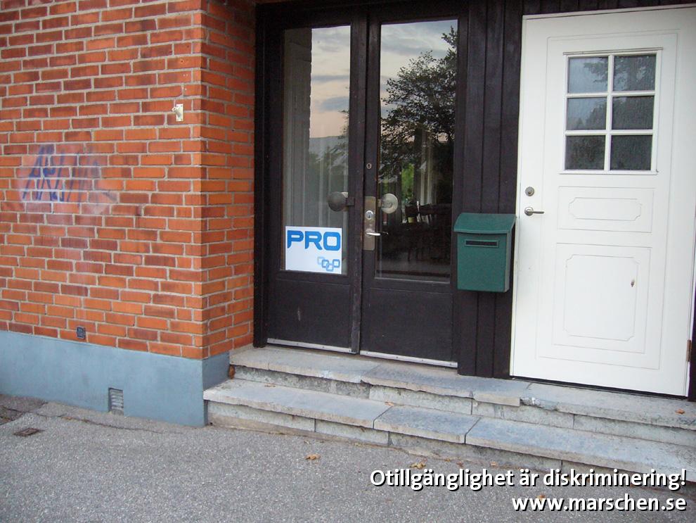 3 trappsteg i entrén stoppar kunder i rullstol eller med rollator. Kontrastmarkering och höger ledstång saknas för synskadade.