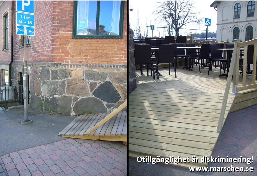 Stolpe hindrar person i rullstol att ta sig upp till första delen av uteserveringen. Stolpen gör antingen utrymmet för litet för att komma in eller ger för litet utrymme för att ta sats för att komma över den dåligt utformade rampens början…. (Uppföljning 2010-11-21) Läs hela anmälan om Jernkällarens uteservering …