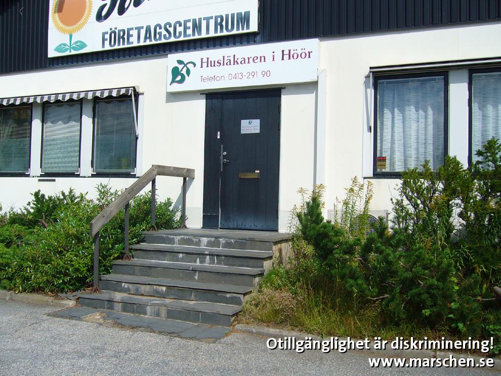 5 trappsteg i entrén stoppar person i rullstol eller med rollator. Kontrastmarkering och ledstänger saknas för synskadade.