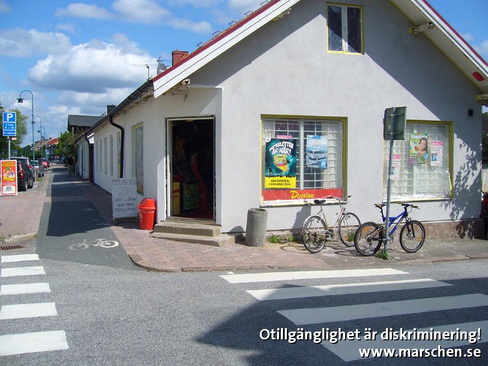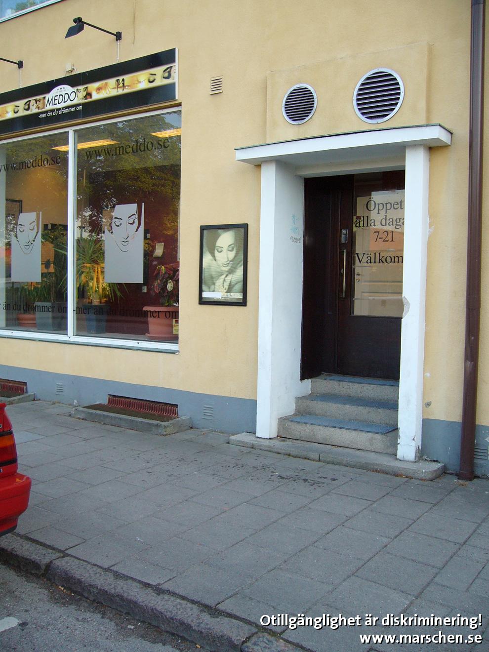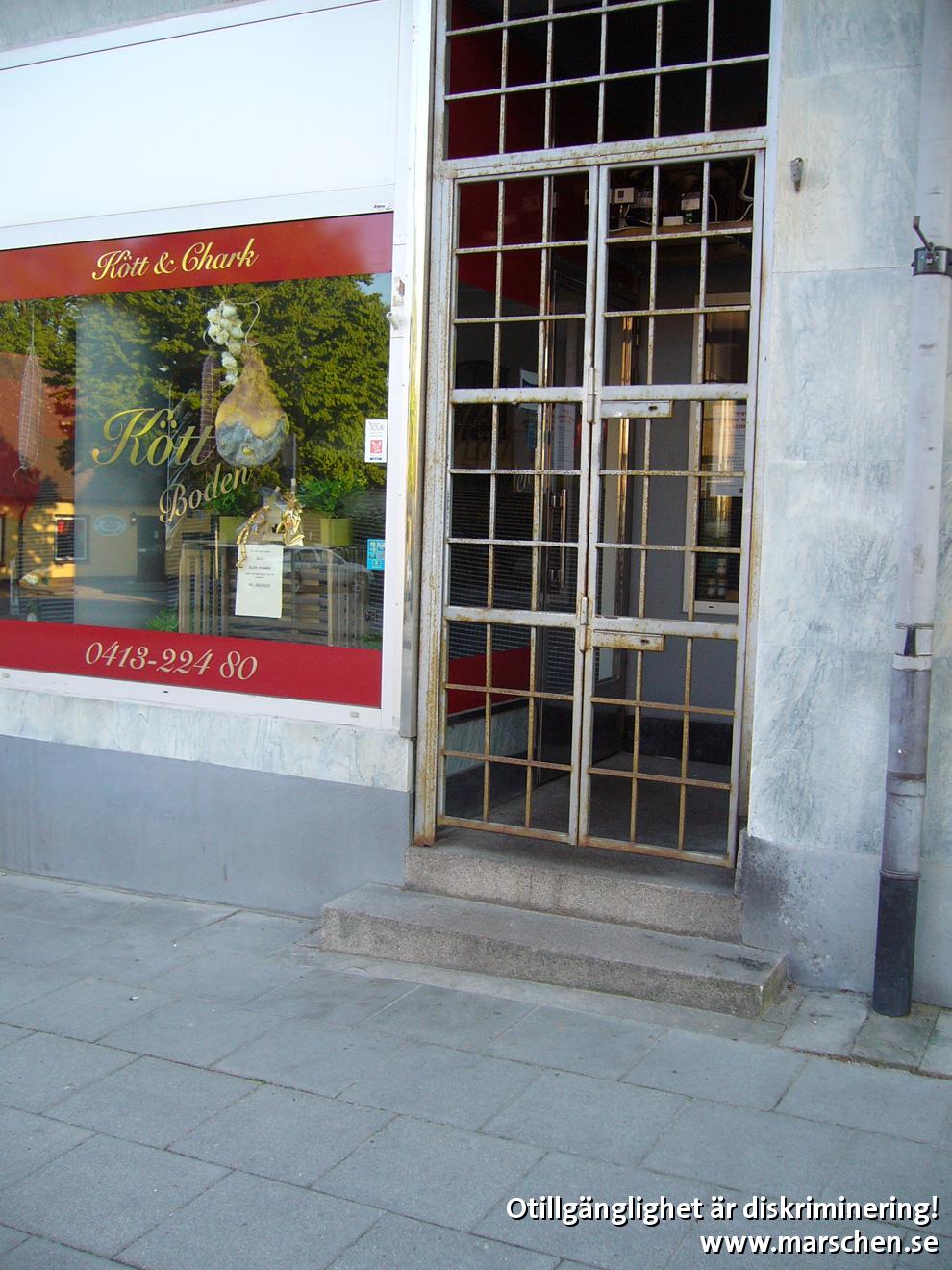 2 trappsteg stoppar person i rullstol eller med rollator. Kontrastmarkering och ledstänger saknas för synskadade. Läs hela anmälan om Köttboden …