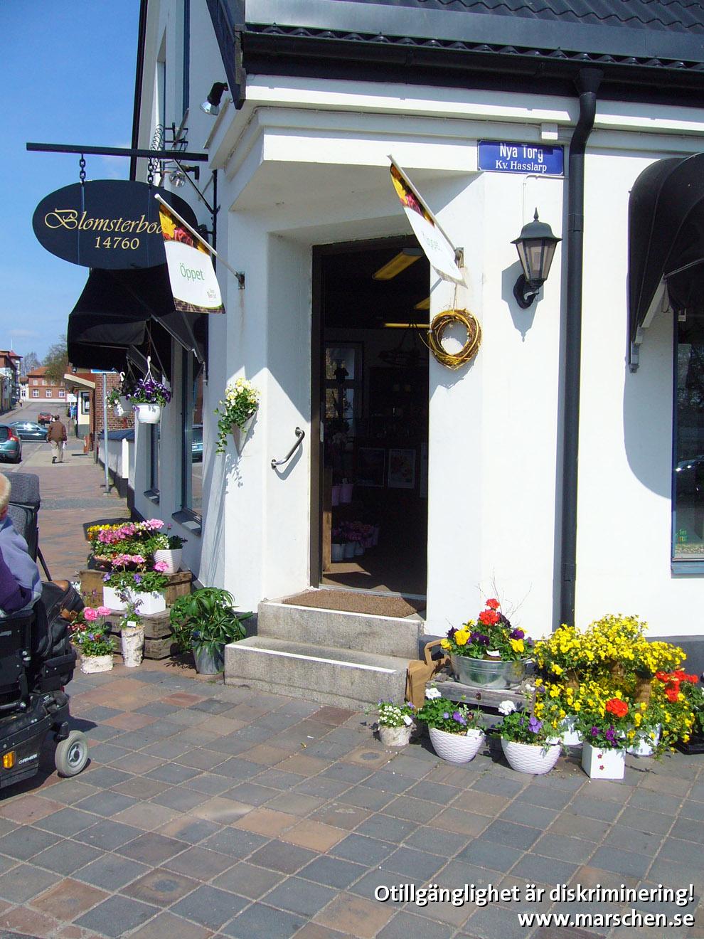 2 trappsteg i entrén stoppar person i rullstol eller med rollator. För korta ledstänger för synskadade. Stora blomkrukor placerade för långt ut på trottoaren. (Uppföljning 2010-11-21) Läs hela anmälan om Blomsterboden i Hörby …