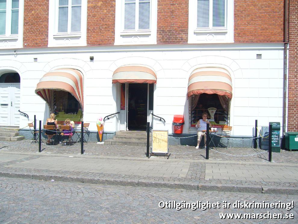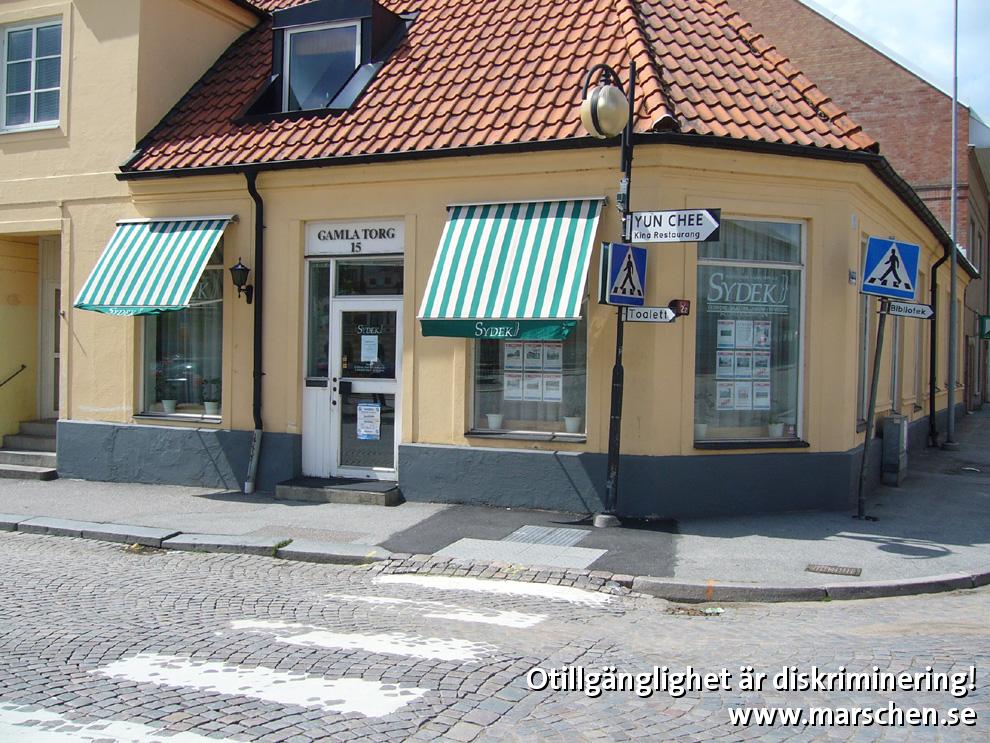 Lokalen har anmälts tidigare, redan 2005-08-11: http://www.independentliving.org/anmalningstjansten/diskriminering_sydek_gamla_torg__horby_2005-08-11.html På fyra år har alltså inget hänt!