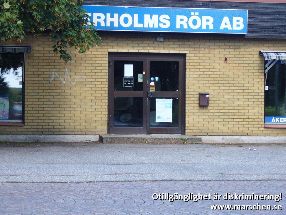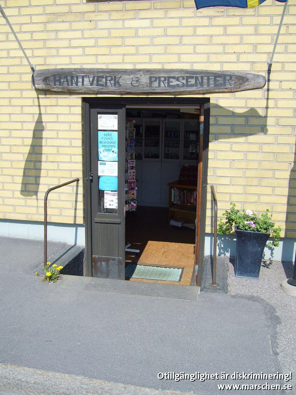 Flera trappsteg ner i entrén stoppar person i rullstol eller med rollator. Kontrastmarkering och ledstänger saknas för synskadade. Läs hela anmälan om Hantverk & Presenter …