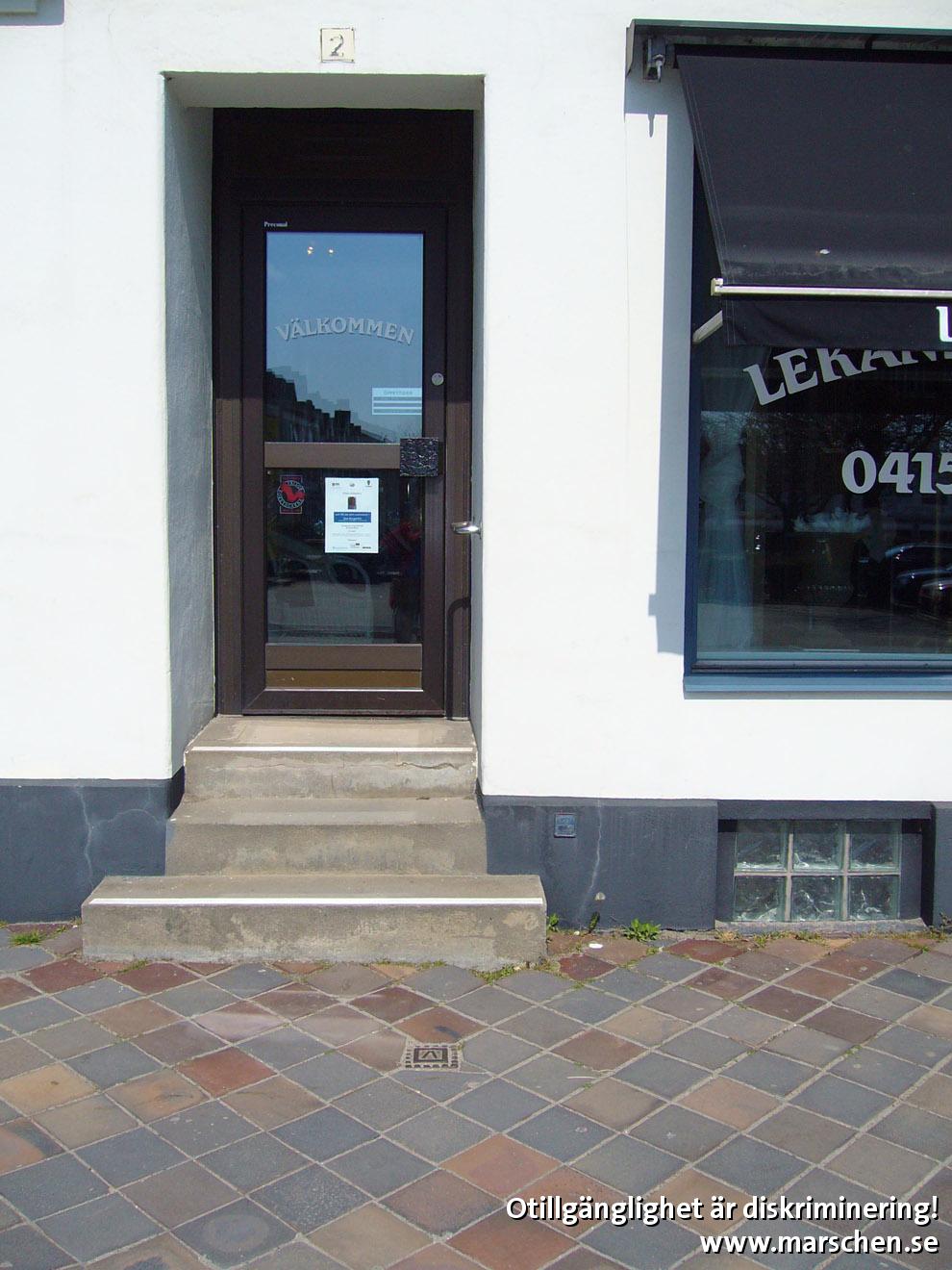 1 trappsteg i entrén stoppar person i rullstol eller med rollator. Kontrastmarkering och ledstänger saknas för synskadade.