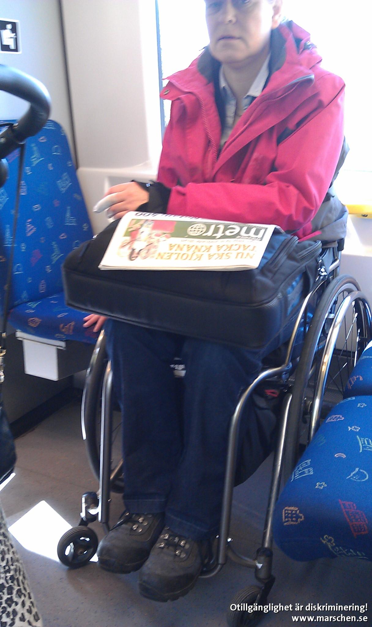 Jag sitter i en manuell rullstol och kan inte åka tunnelbana då det inte finns särskilda platser för personer i rullstol där man tryggt kan spänna fast sin rullstol.