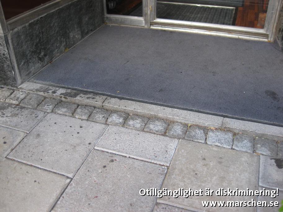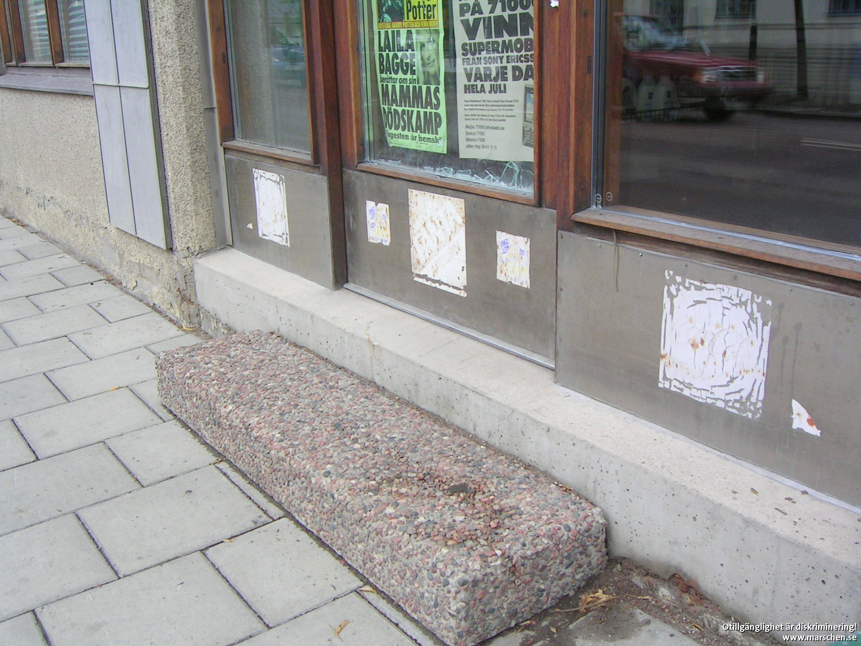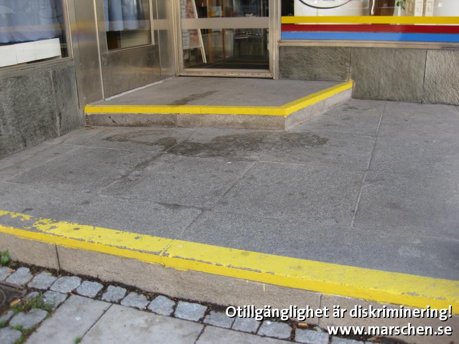 För brant ramp i entrén vilket leder till att människor som använder rullstol utestängs och diskrimineras. Rampens lutning överstiger med god marginal den lagstadgade minimilutningen på 1/12 som helst ska vara 1/20.