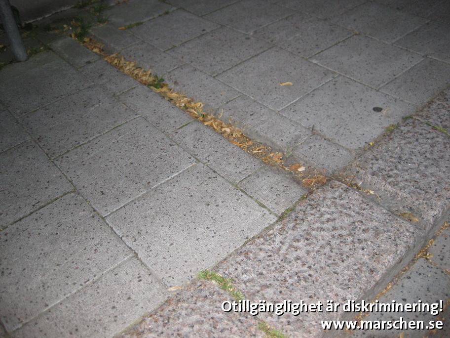 Avfasningen i trottoaren där passage över vägen vanligtvis görs är undermåligt utförd, ska vara nollkant. Det gör det helt eller delvis omöjligt att ta sig upp till och ner från trottoaren om man använder rullstol.